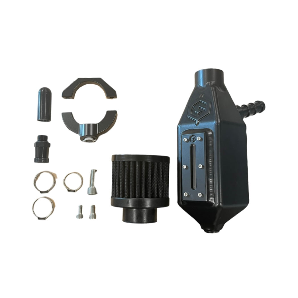 we're proud to release to you another performance product our new Vent to atmosphere catch can assembly. Catch cans are very useful on most boosted and non boosted vehicle applications. The vented system reduces crankcase pressure, as well as captures crankcase blow-by from entering the vehicles intake manifold, intercooler and intercooler piping. Oil built up in these components reduces the efficiency of their cooling capabilities and reduces performance.