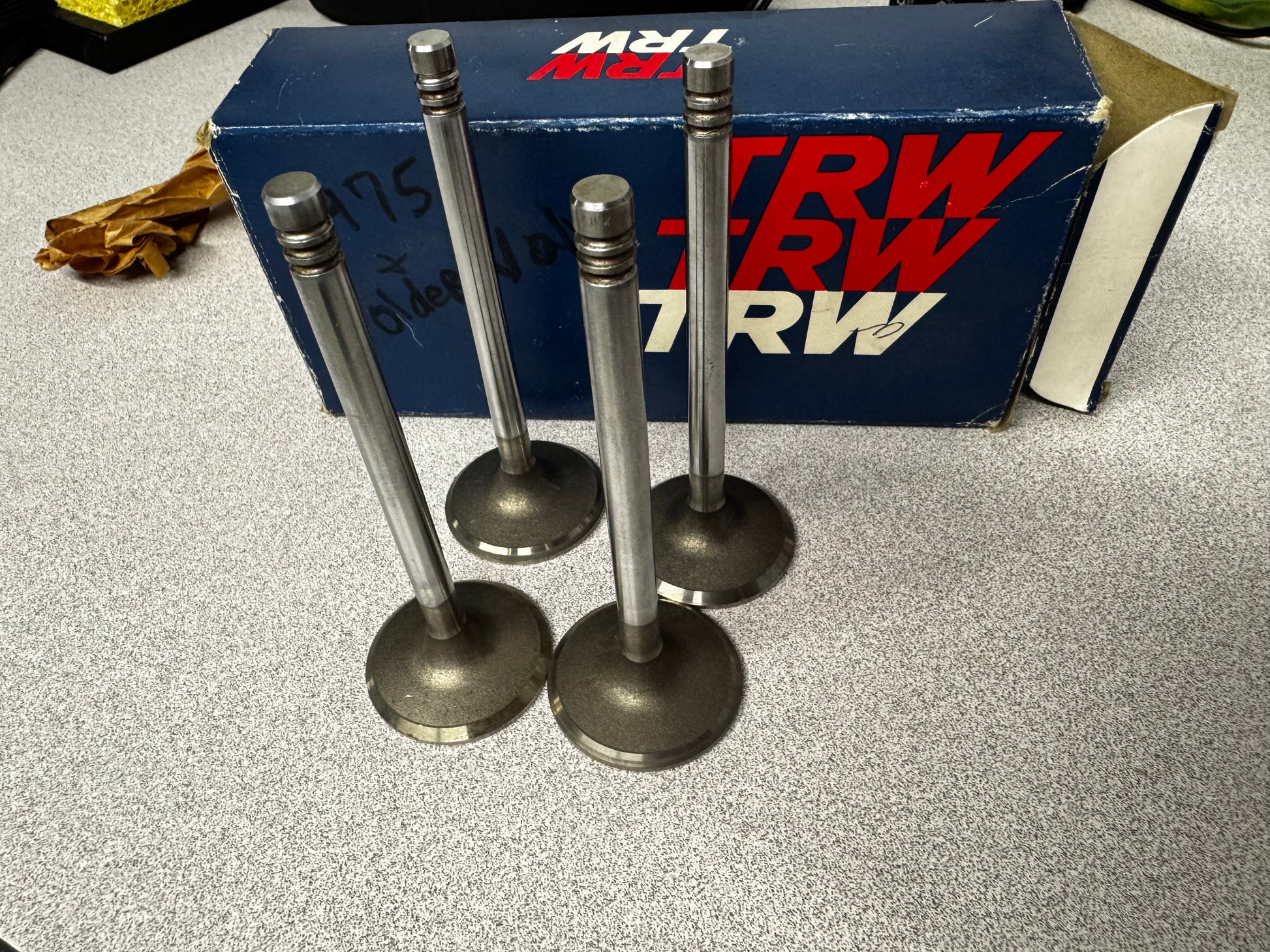 Set of four (4) TRW engine valves, new old stock. Box is marked by hand “1975 and older Volvo.” Based on the measured dimensions, these appear to be likely intake valves for classic Volvo engines (commonly associated with the B20/B30 era), but exact application should be verified before purchase.